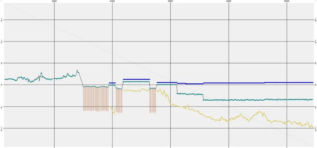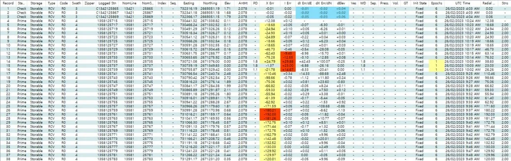 In the image above, the first three lines are check points distinguished by the “c” prefix in the logged station name and the blue highlighting in the dl Err, dX Err and dElev columns. When Position detects check points, it searches the current file then the database for matches. If found, the comparisons are shown as above. If the comparisons are outside the set tolerance, the values would be displayed red. This check not only shows the results of check points, but also assures compliance with positioning specifications.
