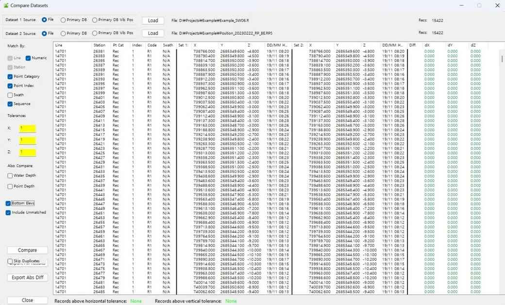 One of the most used features in Position is the Compare Datasets function. Datasets from external files or selections from the database can be compared using various parameters, and the results exported to a csv file. Either all records or just those with detected differences can be exported.