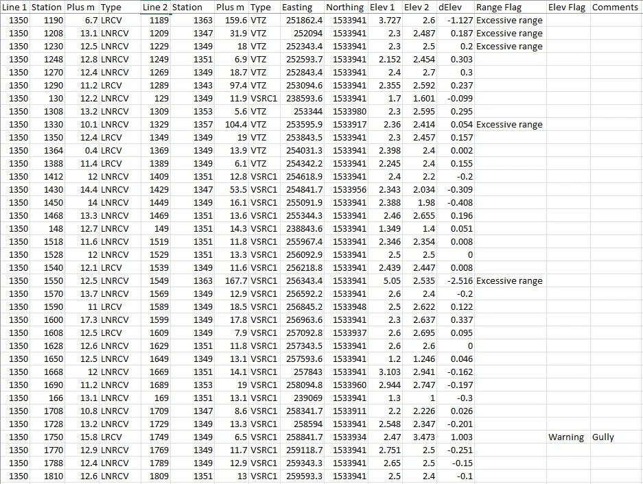 A good final test to run on a data shipment is an intersection report. Position scans a dataset and determines every line crossing. Once it detects a crossing, it calculates the station position on each line then uses these to interpolate an elevation at the intersection for each line. If there is perfectly even slope in both directions, these values should agree. If they disagree, either there is some surface irregularity affecting the interpolation, or there is a local error that wasn’t previously detected.
