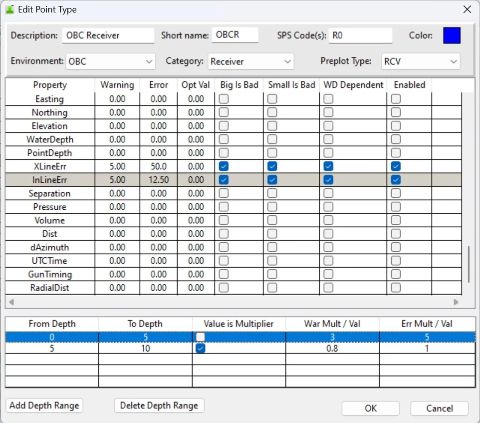 The image above shows a point type setup that includes variable crossline and inline tolerances in different water depths.