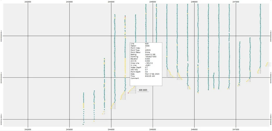 The image above shows the same airgun data zoomed to show more detail around the line ends where the gunboat has turned at the shore to allow more shots. The preplot positions can be seen in grey. The red point near the top is colour coded to indicate a large array separation. The one near the bottom is colour coded to indicate that its crossline position has exceeded normal allowable tolerance for this point type. The point has been right clicked to display extra information about the point.