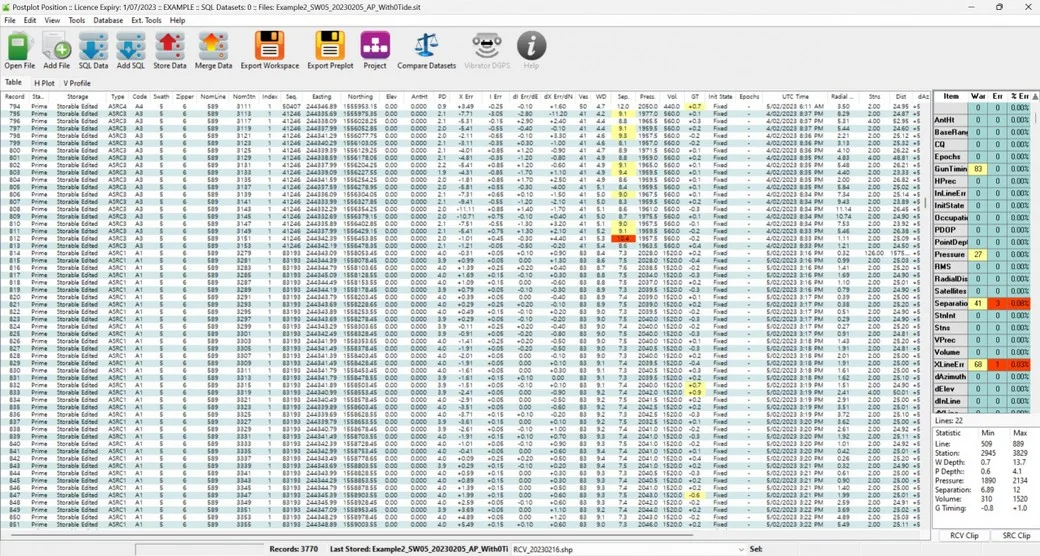 The main display in the table view is a customisable spreadsheet that can display up to 82 configurable columns of position, point type, calculated and QC data. It also has a small side table which displays error and warning counts for all configured tolerances. Below that is a summary table for water and airgun information. Below this again are receiver and source summary clip buttons, which load summary information to the operating system clipboard for inclusion in daily reports. At the bottom of the view is a status bar which contains loading progress, total number of records loaded in the workspace, the last stored dataset input source, the last exported file with a dropdown history, and a total number of selected points.