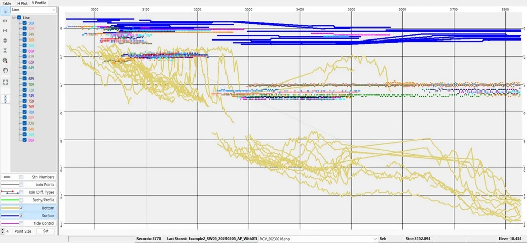 The vertical profile displays a side on view of the data looking across the lines with the low station numbers to the left and high numbers to the right. The same colour coding options as the horizontal plot apply to the vertical profile. As well as the point elevations, the bottom elevation, surface elevation, external tide values and external bathymetry can be displayed. The image can be zoomed and panned. However, the zooming can be performed either vertically or horizontally as required.