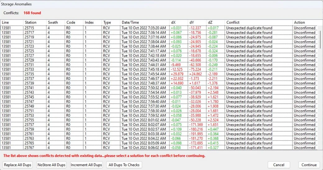 In the image above, 168 duplicates were detected. These were actually moved and resurveyed, so in this case the Replace All Dups button will be clicked. That will change the selection of the Action column to “Replace” for all records. These will allow the storage to proceed. If any records have an Action of Unconfirmed, storage will be disallowed. Records can have their actions individually set if necessary, by clicking in the relevant action cell which will present a drop-down menu.